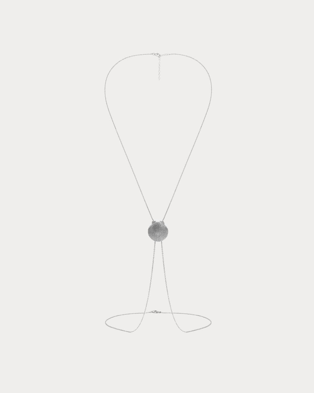 A single hand-carved shell rests against your skin, suspended by strong, lightweight chains that frame your silhouette. Adjustable clasps allow the shell to sit precisely where you choose, becoming part of your natural movement.